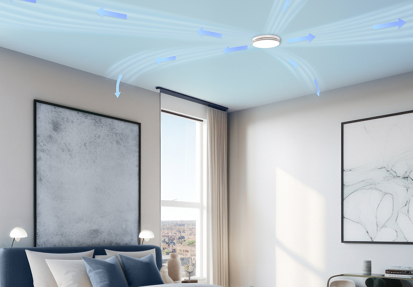 Bright and Airy Bedroom with Modern Poster Mockup and City Skyli