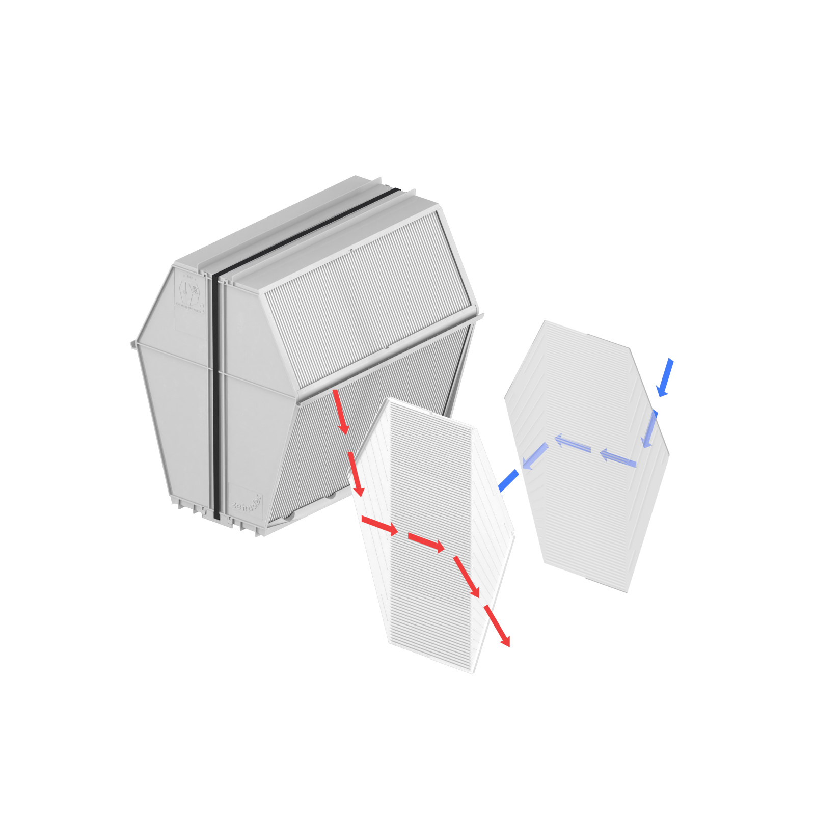 Inside the unit, stale air is exhausted through a high-efficiency core where it transfers heat to the incoming fresh air without mixing. This process: